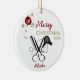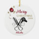 Salon Coiffeur ciseau peigne Sèche-cheveux ornement céramique. Décor noir et blanc pour le professionnel du salon. Cute et Unique. Peigne, ciseaux et sèche-cheveux en noir. Amélioré avec une ampoule rouge à flocon de neige avec ruban et étoiles d'or. Script calligraphie, Personnaliser Joyeux Noël et l'année avec le nom de la personne. Un cadeau parfait pour le professionnel du salon.