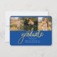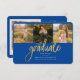 Graduation 4 Photo Collage Script Blue Gold Budget carte de Faire-part. Customisez facilement en changeant le texte et en remplaçant les photos par les vôtres. Une façon moderne et moderne d'annoncer votre diplôme cette année!
