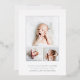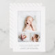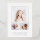 Carte de faire-part de naissance classique avec un design minimaliste avec un collage photo avec trois de vos photos préférées. Ci-dessous, le nom du bébé, les statistiques de naissance et le nom des parents en papier argenté. Le dos a un simple motif gris et blanc rayé. Ce design élégant est une excellente façon d'annoncer l'arrivée de votre bébé garçon.