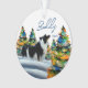 Bordure Collie en hiver Forêt de neige ornement de Noël Arbres. Paysage neige d'hiver calme avec une belle collie frontière noire et blanche et des arbres de Noël colorés. Le nom du chien est dans un script tendance. Jolie décoration de vacances pour les propriétaires de collie frontière, amoureux de les chiens et amoureux des animaux. Personnalisez le nom et l'année.