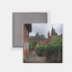 Aimant photo souvenir avec un sentier menant à Collonges-la-Rouge, le village rouge, avec ses maisons rouges et son château en pierre rouge avec tours dans le Limousin, à la frontière avec la Dordogne en France.