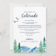 Ces cartes d'accueil et d'itinéraire mariage du Colorado sont parfaites pour un mariage extérieur. Le design comprend un paysage sauvage peint en bleu et vert avec des pins d'aquarelle, des oiseaux et des montagnes. Le recto de la carte comporte une lettre de bienvenue et le verso de la carte indique l'itinéraire du mariage. Ces notes sont parfaites pour les mariages de destination et les sacs de bienvenue des clients de l'hôtel. Customisez cette lettre pour tout lieu de mariage de destination de montagne.