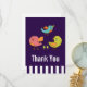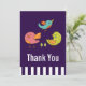 Un carte de remerciements plat avec un message sur le dos que vous pouvez personnaliser. Conçu avec un trio d'oiseaux à la main mignons et fantaisistes. 2 des oiseaux se tiennent ensemble avec quelques minuscules pins verts entre leurs pieds. Un autre oiseau bleu vole dans l'air entre eux. Placez-vous sur un arrière - plan violet.