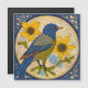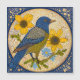 Illustration colorée d'un oiseau perché sur une branche, entouré de fleurs jaunes et de marguerites bleues. L'oeuvre est composée d'un motif en pointillé et d'un harmonieux mélange de tons bleus, jaunes et terreux, créant une composition joyeuse et animée.