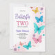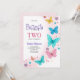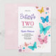 Colorful butterfly-themed birthday invitation. Text reads "Butterfly Birthday, Two" for Sophia Robinson. Pastel butterflies and flowers create a cheerful, whimsical tone.