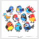 A lively collection of twelve cartoon-style bird stickers in bright colors. Ideal for kids crafts, scrapbooks, or classroom décor, conveying friendship, playfulness, and nature-inspired charm.
