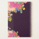 Planner with spiral binding featuring an arrangement of flowers in peach, pink, salmon, and periwinkle against a dark plum background. Personalize this planner with your name and year in white letters.