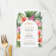 A beautifully lush tropical party menu design with colorful watercolor floral elements that include hibiscus blooms, ginger flowers and a variety of tropical foliage surrounding a stylish arched frame. The looks is vibrant and alive and sets the tone for your celebration in aloha style. Personalize the easy-to-use text template with your menu items. If you need to move the text around, add or remove lines of text, select "click to customer further", which will open up the design template to make additional changes. Whether you are having an outdoor barbecue or a poolside luau, this menu is a beautiful choice.