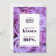 Moderne minimaliste violet Roses Combien de baisers Fête des mariées Jeu Carte Tabletop Faire éclater vos détails de l'événement avec cette élégante carte tabletop! Cette carte personnalisable 5x7 dispose d'une belle aquarelle en toile de fond de roses violets romantiques, parfaitement encadrée par une disposition blanche propre. Le front est conçu avec l'invite de jeu amusant, "devinez combien de 'baisers' pour le prochain être 'mrs.', placé dans un script élégant. Il est personnalisé avec le nom de la future mariée et les mots "Fête des mariées". Cette belle carte de table est le moyen parfait pour que les invités s'adonnent à une activité de douche nuptiale amusante. Mais la meilleure partie ? Le dos ! C'est une toile magnifique pour une photo mémorable de la future mariée, avec une élégante typographie de son futur nom. Cela garantit un affichage sans faille de n'importe quel angle lorsqu'il est placé dans les supports de cartes, les supports en bois ou les supports de clip (non inclus). Cette tenue de séjour est un complément étonnant et fonctionnel à votre événement. Il suffit de le personnaliser avec son nom et ses détails pour créer une belle enseigne de jeu moderne.