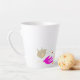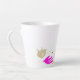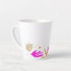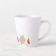 Cette tasse présente dans sa bordure inférieure un ensemble de lames et de fleurs en beige, magenta, rouge et orange sur l'arrière - plan blanc.