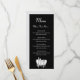 Une carte de menu pour les mariages, les célébrations ou les restaurants avec un design simple mettant en vedette un ensemble de couverts sur une jolie serviette de table blanche embellie de gris et de noir. Personnalisez-le pour changer les polices, les couleurs de fond, même enregistrer votre conception pour plus tard.