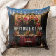 Concept pour le devant d'un coussin à double face : une scène bohème et rustique magnifiquement éclairée à la tombée de la nuit avec des lumières féeriques, des fleurs vibrantes, des accents vintages, et un accueil central "Bonne Fête des Mères".