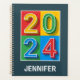 Belle géométrie colorée 2024 design avec chiffres et rectangles bleus, rouges, jaunes et verts. Vous pouvez changer la couleur arrière - plan facilement. Il est facile de le customiser en changeant les noms, la date, le texte, etc.