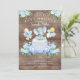 Conduisez par baby shower design avec un adorable éléphant, voiture bleue avec cadeaux, ballons et joli bouquet de fleurs bleues. Retournez notre invitation pour voir un dos à floral coordonné pour une touche spéciale.