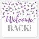 Bienvenue autocollants avec motif à confettis argenté et violet.