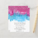 Une invitation à la fête de révélation de genre Bébé brillante et colorée. Sur un arrière - plan blanc, la fumée bleue et rose et les confettis de parties scintillant tombent lentement autour du texte typographique qui lit Baby Your Surname. Personnalisez en ajoutant tous les détails de votre événement à l'avant et à l'arrière.