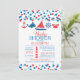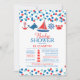 Baby shower nautique confetti moderne pour bébé garçon. Notre invitation de baby showers garçons contemporain et amusant dispose de confettis rouge & bleu audacieux et lumineux sur un arrière - plan blanc avec voilier rouge & bleu, baleine, roue de navire, ancre & crabe et un phare.