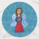 Ce confetti de table a de grands cercles bleus avec des étoiles d'or et un ange américain dans une robe rouge blanche et bleue tenant le drapeau américain. Les cercles moyens sont bleu foncé et les petits cercles sont rouge vif.