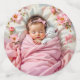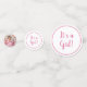 Un baby shower sucré "c'est une fille" confetti baby shower avec une petite fille enveloppé dans des couvertures blanches et roses molles, bouillonnant avec son chaton et entouré de fleurs roses.