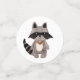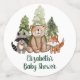 Joli confetti de table de baby shower avec des illustrations d'aquarelle d'animaux de bois avec leur tente et feu de camp campant dans les montagnes et la forêt et "Adventure Awaits" et le nom de la future mère dans un script vert foncé.