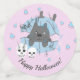 Chat rose dans les crânes Citrouilles Candy Corn Pastel Halloween confetti. Dessin simple d'un chat dans un citrouille avec deux crânes éffrayants et des bonbons. Idéal pour la fête d'Halloween pour enfants.
