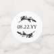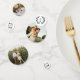 Table mariage romantique confetti personnalisé avec des photos, votre monogramme à l'intérieur d'une couronne de laurier, le mot amour, et votre mariage date avec des polices noires contre un arrière - plan blanc.