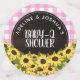 Table de baby shower rustique en vichy barbecue rose confetti avec tournesol, en vichy rose, un coeur mignon, et deux photos.