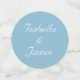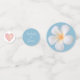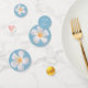 Mariage Blanc Frangipani Plumeria Fleurs sur lumière merveilleuse bleue Table Confetti. Le texte peut être personnalisé pour les mariages, les anniversaires et les anniversaires. Les fleurs frangipaniennes sont synonymes de beauté et d'amour parfait.