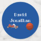 Le design personnalisé Boy Toys coordonne avec l'adorable "Boy Toys" thème invitation à la douche bébé, décorations et accessoires de pépinière. Le nom de l'enfant est affiché en lettres blanches contre un arrière - plan bleu vif. Des images d'un baseball et d'un basket sont affichées sur un côté. Les images ci-dessous montrent une voiture de course de jouets et un ballon de basket.