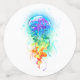 Grande méduse irisée, artistiquement dessinée, brillante, avec de longues tentacules sur le blanc, peinte sur l'arrière - plan multicolore. Méduse arc-en-ciel.