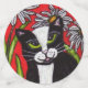 Ce confetti de table a de grands cercles avec le visage d'un chat tuxedo noir et blanc avec les yeux verts avec des fleurs de marguerite blanche derrière lui sur un arrière - plan rouge vibrant. Les cercles moyens sont noirs et les petits cercles sont rouge vif.