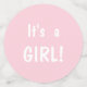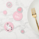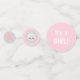 Ce joli confetti de table est parfait pour un baby shower, surtout quand le petit attendu est une fille ! Dans les tons rose et gris doux, il s'agit d'un adorable poney tacheté. D'autres images comprennent un soleil, un coeur de polkadot et une étoile. Votre texte personnalisé est en blanc sur un arrière - plan rose. Merveilleux pour une soirée révélatrice de genre ! Graphiques de Prettygrafik Design, © Prettygrafik.com