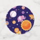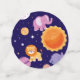 une motif sur le thème de l'espace. Ce motif présente une variété d'objets célestes et d'animaux. Il existe des planètes de tailles et de couleurs différentes, comme le violet, l'orange et le jaune, ainsi qu'un soleil éclatant. En outre, il y a des animaux animés, dont un éléphant rose, un lion jaune et un hippopotame violet, flottant au milieu des corps célestes. L'arrière - plan est un noir profond, accentuant les couleurs vives des planètes et des animaux.