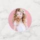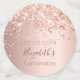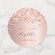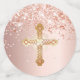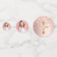 Un arrière - plan d'or rose décoré de poussière de parties scintillant d'or rose. Personnalisez et ajoutez une date et un nom/événement. Lettres de couleur or rose foncé. Quelques jetons de confetti avec nom et date, d'autres avec une croix. Ajoutez votre propre photo sur deux des puces.