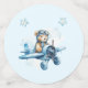 Un mignon ours en peluche dans un avion bleu vole à travers les nuages avec un couple d'étoiles au-dessus. Tout le texte peut facilement être modifié à vos informations.