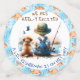 Baby shower confetti. Une adorable petite aquarelle douce illustrant un petit garçon qui pêche avec un chien de chiot. Les couleurs de ces invitations sont le bleu et l'orange. Beau poisson nageant dans l'arrière - plan.