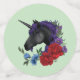 Une licorne noire en profil est entourée de fleurs rouges, bleues et violettes sur un fond vert sage doux.
