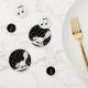 Ce confetti de table a de grands cercles avec un chat blanc en train de se balader sur les touches de piano sur un arrière - plan noir avec des notes de musique blanche. Les cercles moyens sont blancs avec une note de musique noire, les petits cercles noirs avec une note de musique blanche.