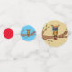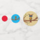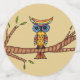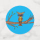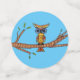 Ce confetti de table a un hibou abstrait coloré avec de grands yeux bleus assis sur une branche d'arbre avec des feuilles verts. Les grands cercles ont un arrière - plan bronzé, les cercles moyens ont un arrière - plan bleu et les petits cercles sont rouge vif.