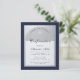Une invitation à la confirmation moderne. Sur un arrière - plan rectangulaire bleu marine, il a un faux arc de feuille d'argent qui a à l'intérieur du texte bleu marine sur arrière - plan blanc. Le mot Confirmation et le nom sont écrits dans un élégant script calligraphique ; la première ligne est du texte arché.