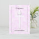 Cette belle invitation à la Confirmation présente une croix et une colombe sur un arrière - plan rose comme un nuage avec le nom de votre fille. L'arrière de l'invitation est disponible pour les détails de votre invitation de confirmation personnalisée. Copyright henishouseo