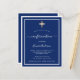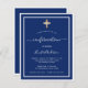 Une invitation moderne, élégante et raffinée. Un arrière - plan bleu marine décoré de cadres blancs et d'une croix dorée. Personnalisez et ajoutez un nom et des détails. Texte blanc.