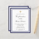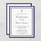 Une invitation moderne, élégante et de confirmation. Un arrière - plan blanc décoré de cadres bleu marine et d'une croix dorée. Personnalisez et ajoutez un nom et des détails. Lettres de couleur noire, élégant script de style manuscrit.