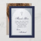 Un carte de remerciements de confirmation bleu marine pour un garçon. Sur un arrière - plan rectangulaire bleu marine, il a un faux arc de feuille d'argent qui a à l'intérieur du texte bleu marine sur arrière - plan blanc. Les mots "Merci" et le nom sont écrits dans un élégant script calligraphique ; le reste en casquette. Sur le dos il y a une photo d'un garçon, de Pixabay, qui est généré par ordinateur (pas une personne réelle) et gratuit pour un usage commercial.