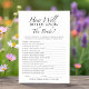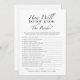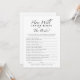 Présentation de la carte de jeu "How Well Do You Know The Bride?", un ajout élégant à toute douche nuptiale! Avec un design minimaliste noir et blanc, cette carte de jeu invitation les invités à tester leurs connaissances sur la mariée de manière amusante et attrayante. Parfait pour créer des moments mémorables et des rires, il s'intègre parfaitement dans n'importe quel thème de douche nuptiale. Conçue par CaMiDesigns, cette carte de jeu est une façon délicieuse de célébrer la future mariée. Pour obtenir de l'aide sur les commandes, l'expédition, les informations sur les produits, etc., veuillez contacter directement le service à la clientèle de Zazzle.