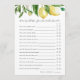 Testez vos connaissances de vos invités avec cette carte de jeu "How Well Do You Know the Bride?", qui présente d'élégants citrons aquarelles et une verdure luxuriante. Parfait pour les douches nuptiales, les bachelorettes ou les fiançailles. Ce jeu élégant et amusant est entièrement modifiable et disponible en version imprimée ou en téléchargement numérique. Un joli ajout à toute célébration sur le thème des agrumes ou du jardin de Redwood & Vine Design Co.