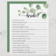 C'est comme ça que vous savez que le jeu de la mariée douche nuptiale est une activité parfaite pour une célébration minimaliste de la douche nuptiale. L'aménagement comprend des branches et des feuilles d'eucalyptus botaniques élégants dessinés à la main dans des aquarelles.