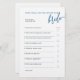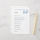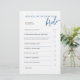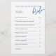 Cet élégant jeu de douche nuptiale est une façon amusante de célébrer la future mariée! Avec son script bleu classique et son agencement minimaliste, vous pourrez répondre à 15 questions personnelles pour savoir qui connaît le mieux la mariée. 💍 Double face, 💙 Coordination avec notre collection "Pop the Bubbly", ✨ Parfait pour les douches nuptiales, bachelorettes & brunches