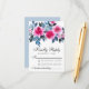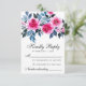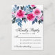 Elégant design de carte RSVP avec roses d'aquarelle rose vif, feuillage bleu et gris sur un arrière - plan blanc. Le côté inverse de la carte est en bleu poussiéreux.