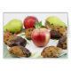 Les friandises d'automne trempées dans du chocolat et entourées de fruits. Les biscuits citrouilles à puce chocolat Tombent à moitié trempés dans le chocolat entouré de pommes, poires, feuilles, cône de pin. Cela rend un beau plateau de fête d'automne ou d'automne idéal pour autour d'Halloween ou Thanksgiving. citrouille_cookies_fruit_feuilles_OPJ300